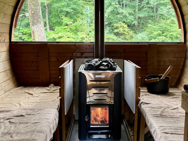 広めのテントサウナにツインターボの薪ストーブ。110℃と高めですが、結構ドライなので熱すぎるという感じはありませんでした。