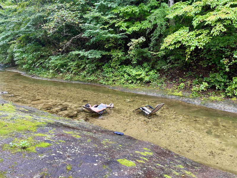 湖水温は14℃ほど、春のこもれびを感じながらインフィニティチェアでばっちりととのいましたw(チェアの後ろで湖畔を散歩する人の往来があり、ちょっと恥じらいを感じましたが^^;)