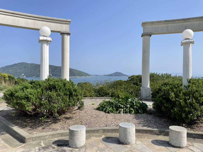 露天風呂のところに椅子2脚あるが、下に座っていた。瀬戸内海も見えるし何だかギリシア調で開放感がある。