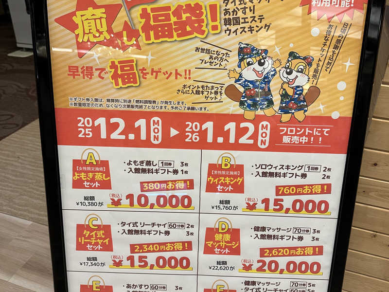 サウナ:超高温フロア7分 × 2、8分 × 1、9分 × 1、爆風アウフグース × 1