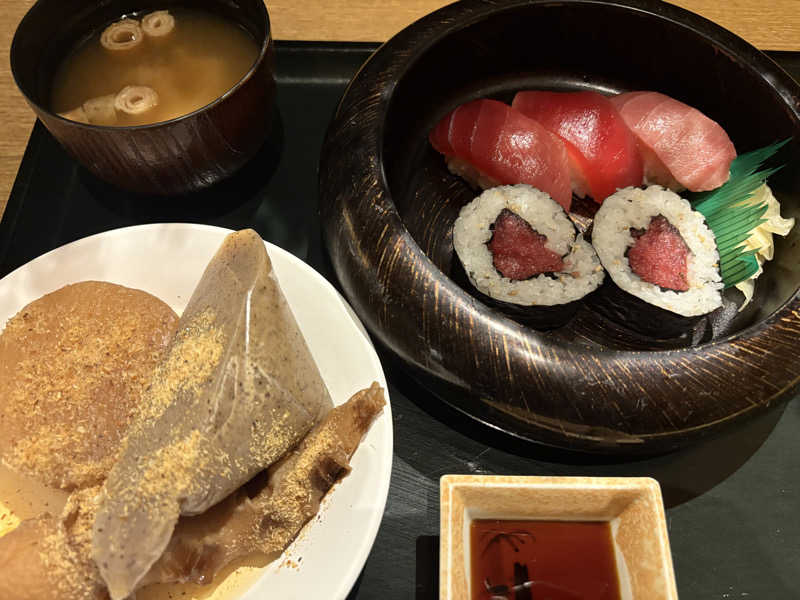 お風呂上がりの晩ごはんは100円引きになってたお寿司とおでん、今日は大根があった!笑