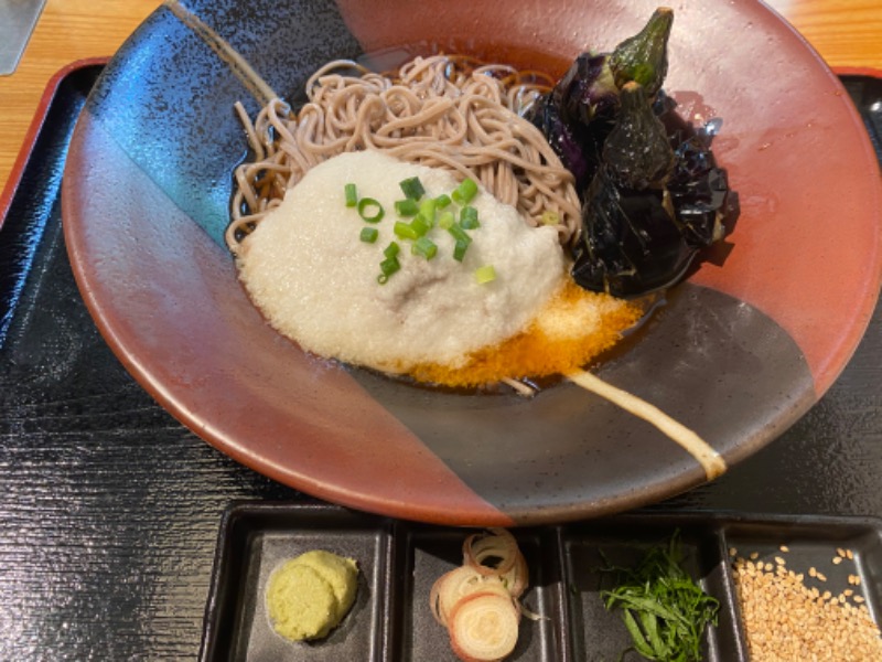 お昼は、揚げ巾着茄子とみょうがのおそば。さっぱり美味しい(*ˊᗜˋ*)♡