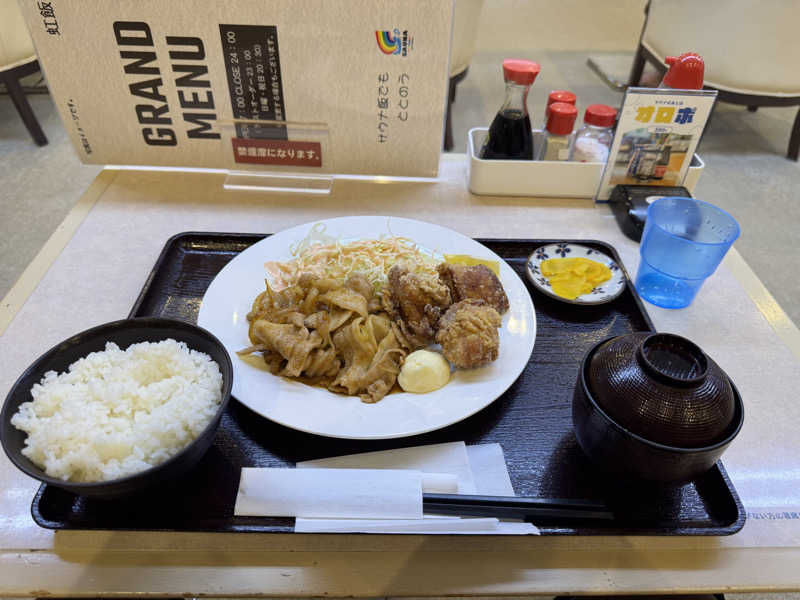10時頃in。 午前2セット昼2セット夜2セットの6セットで帰宅。 午前中に唐揚げカレーを食べ、夕方に生姜焼き唐揚げ定食食べました! 途中2階のリクライニングで爆睡してました! レインボー最高!!!