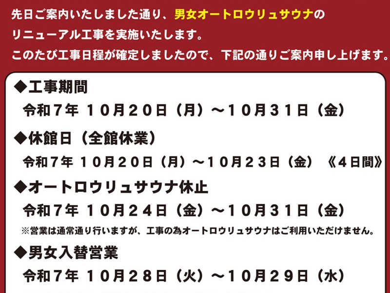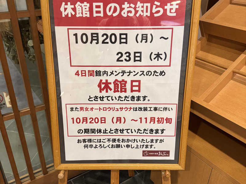 休日ならではのハプニング!平日ならそんな事無いのでびっくりでした‼️マット交換の時はスタッフさん重たくて大変そうでした!サウナに入る時は体に着いた水を拭きとる位のマナーを守ってほしいものですね👊💢