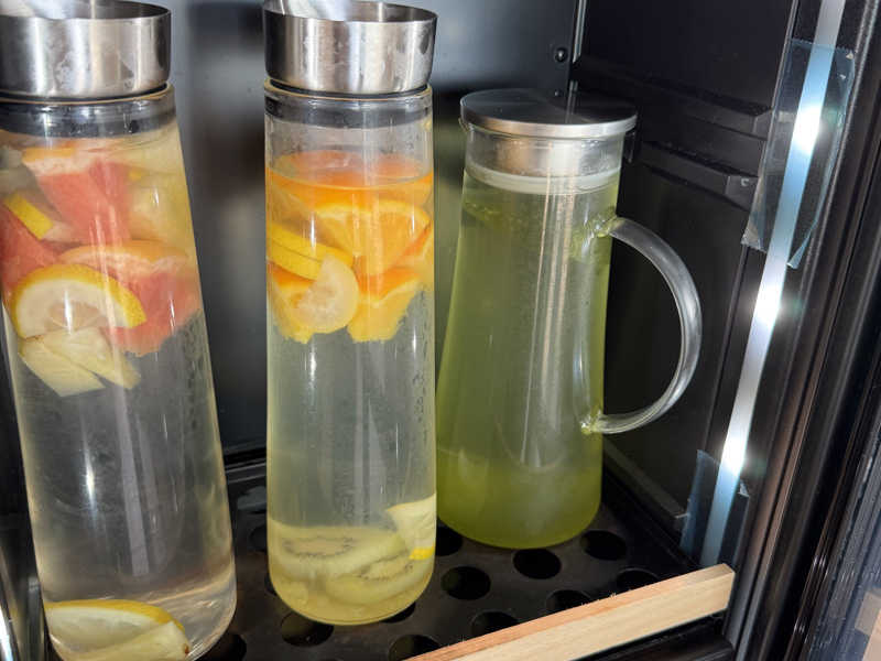 ラウンジではデトックスウォーターに焼きリンゴのカスタードプリンまで自由に。