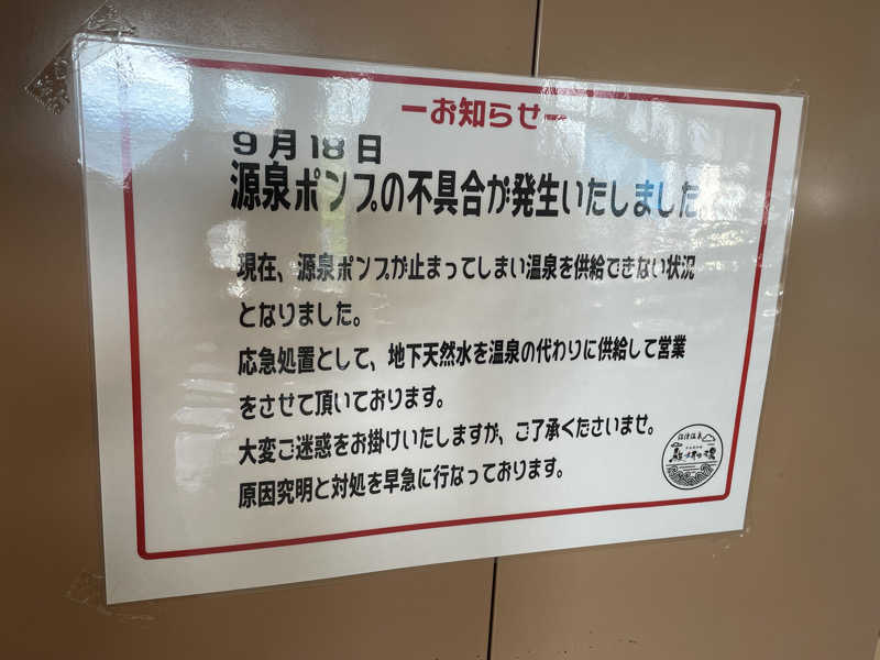 温泉ポンプの不具合で温泉供給ができないスクランブル状態