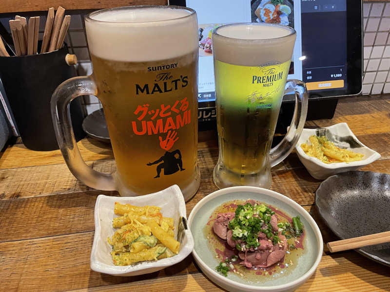 デカいビールを頼み、カルパッチョ、白レバー、揚げとうもろこし、パスタにピッツァ🍕