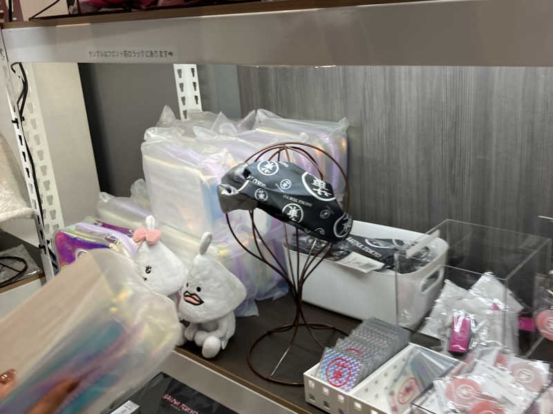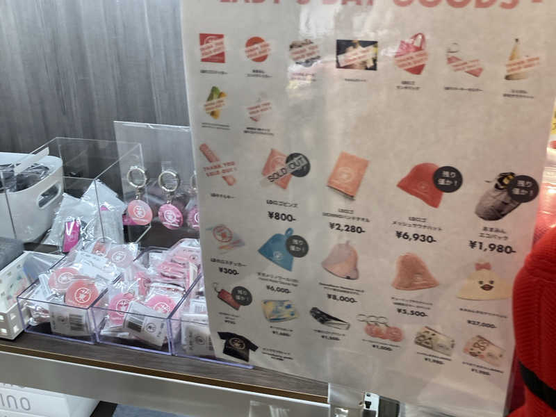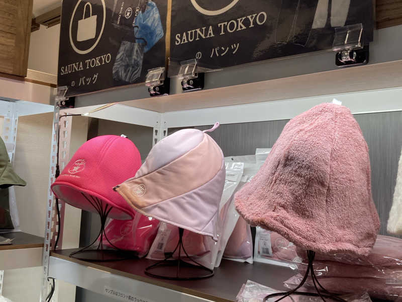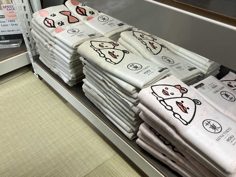 入店してまずはグッズ。おニューのものは大体買う。そう言えばサウナハット持ってき忘れたのでどピンクのん買う。