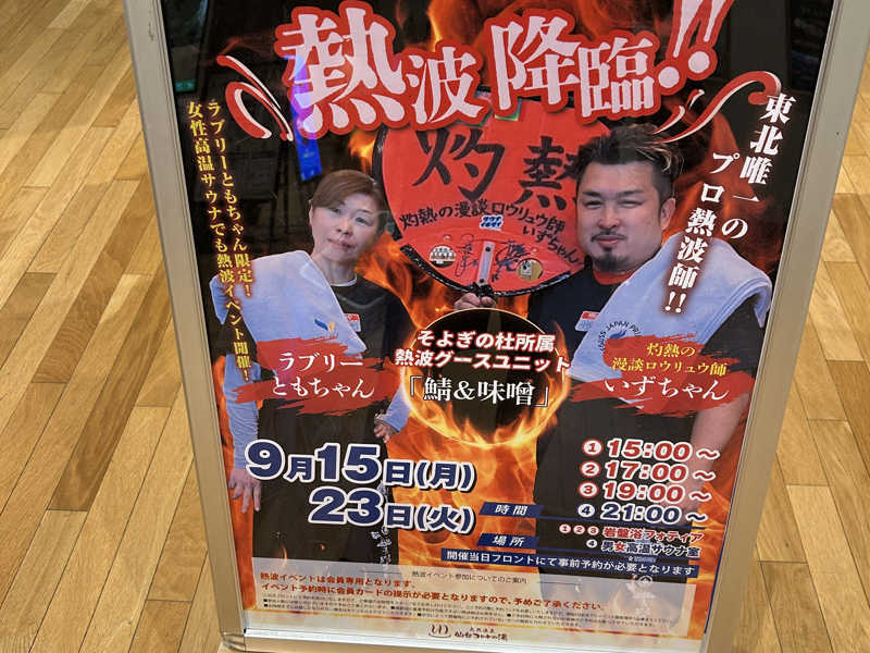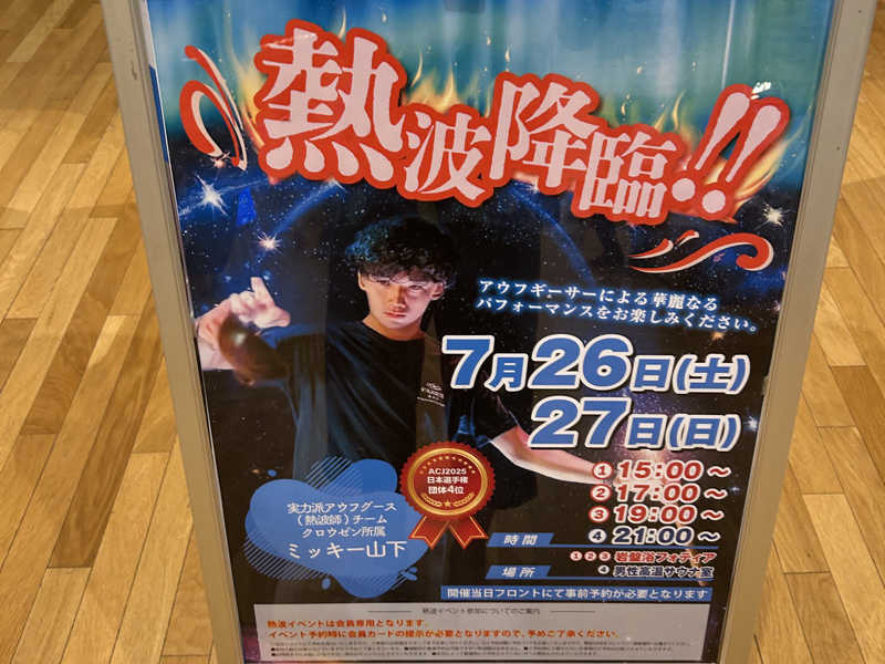 今日は激アツでした🥵タオル捌きは勿論、岩盤浴室内の温度も爆上げ🥵19時回は番長山下?面白さあり、熱さありの最高の回でした!毎度アチアチ熱波ありがとうございます!また参加します!