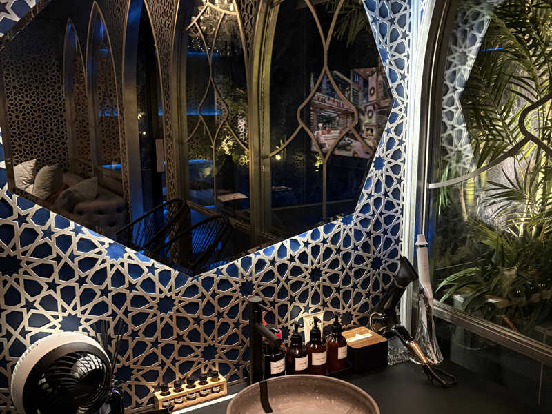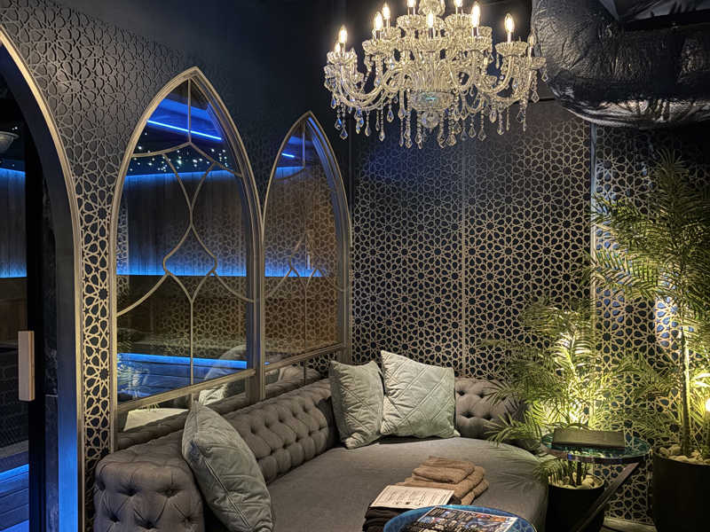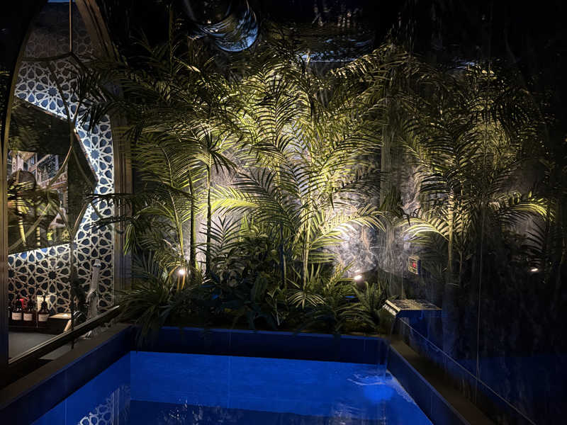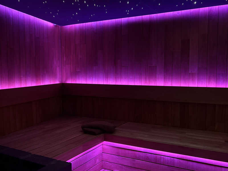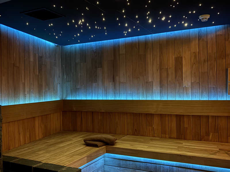 念願の「Blue Mosque」120分18,000円で忘年会!部屋を真っ暗にして星空サウナと14℃水風呂で飛べる。セルフロウリュからのアウフグースボタンで火傷レベルの熱さ。サウナ室の色変えられたりラブホ感強いが特別な時間になりました。