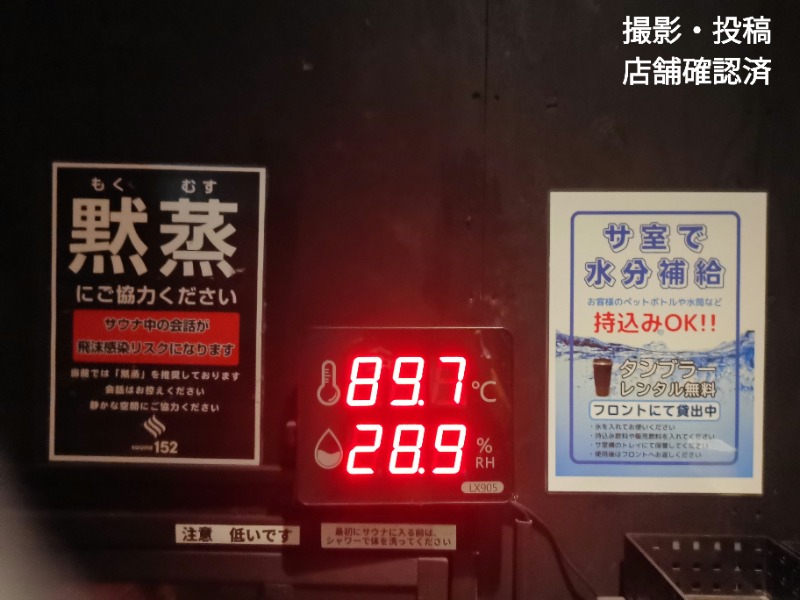 温度計・湿度計は室外。90℃程度。デジタル時計有。シャワー利用中表示付。全ブースジャンボタオルを敷いて利用。一応ビート板もある。座りもいいが、寝サウナ上段がバツグンに良い。