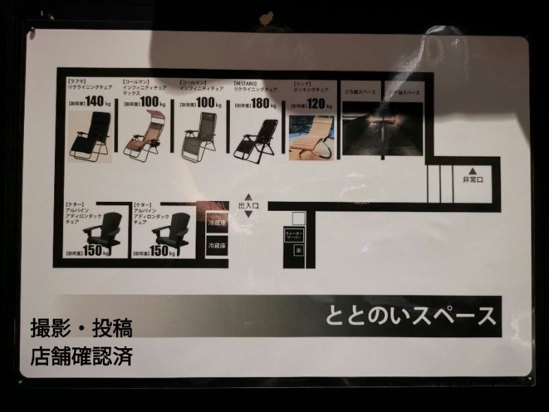 同店舗のメイン商材とも言えるととのいスペース。WEBサイト写真と異なり通路側も仕切られている個人ブース形。入店から退店まで占有できる有り難さ。