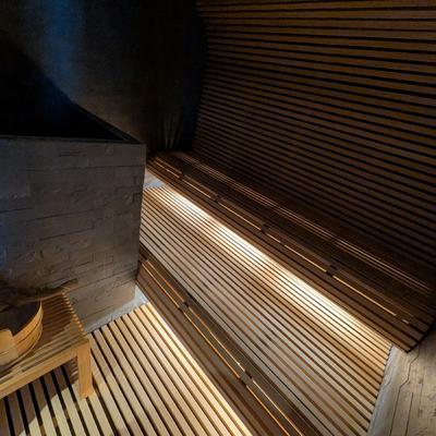 サ室は2段で12人ほど入れますかね。入ったときは90度。セルフロウリュしても90度で心地よいです。