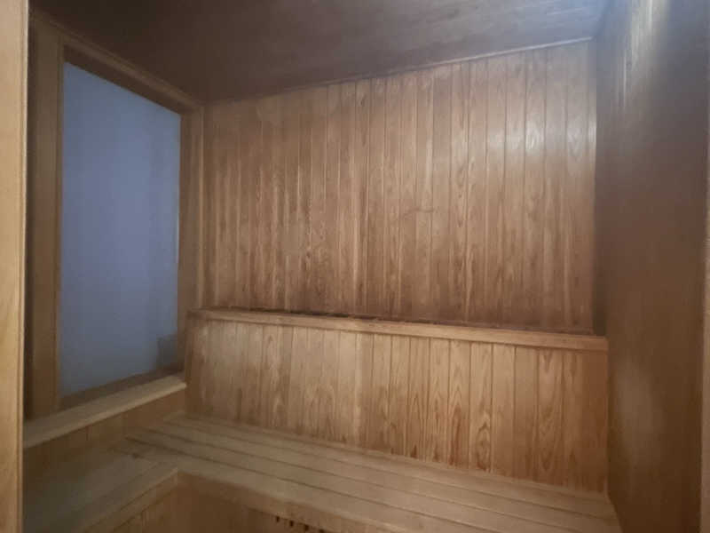 更衣室内でガラス張りのサウナは、誰かいるとショーケースに入って見られているような感じにもなるが、誰もいないので問題なし。