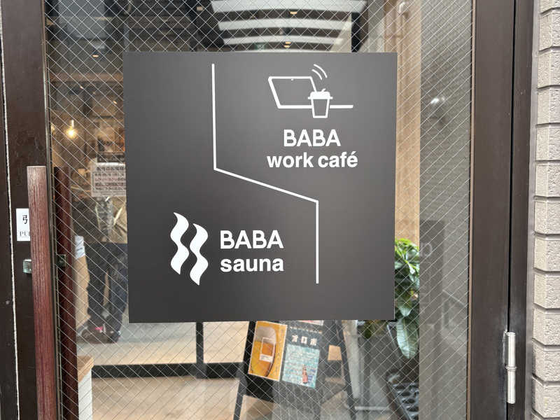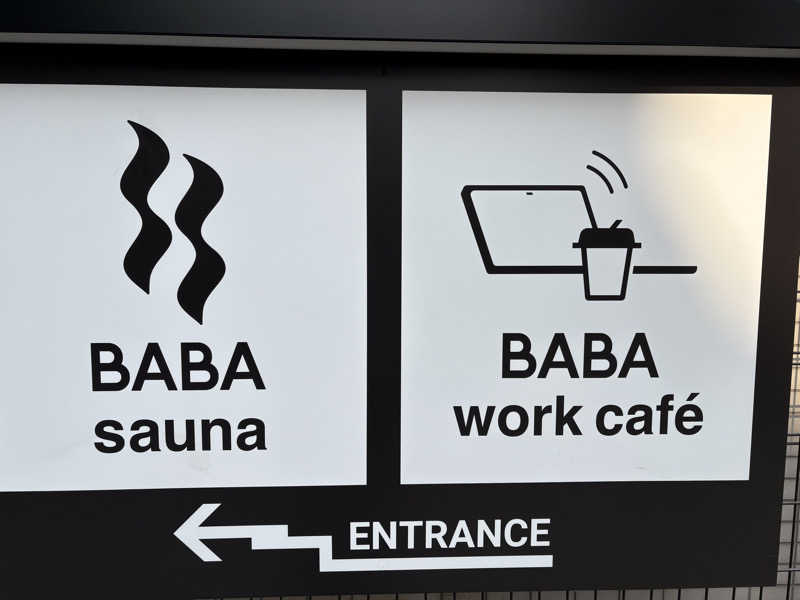 サ室内は薄暗くBABA sauna のカッコ良い看板が壁の中央にあり2つのタワー型サウナストーブが中央に鎮座している
