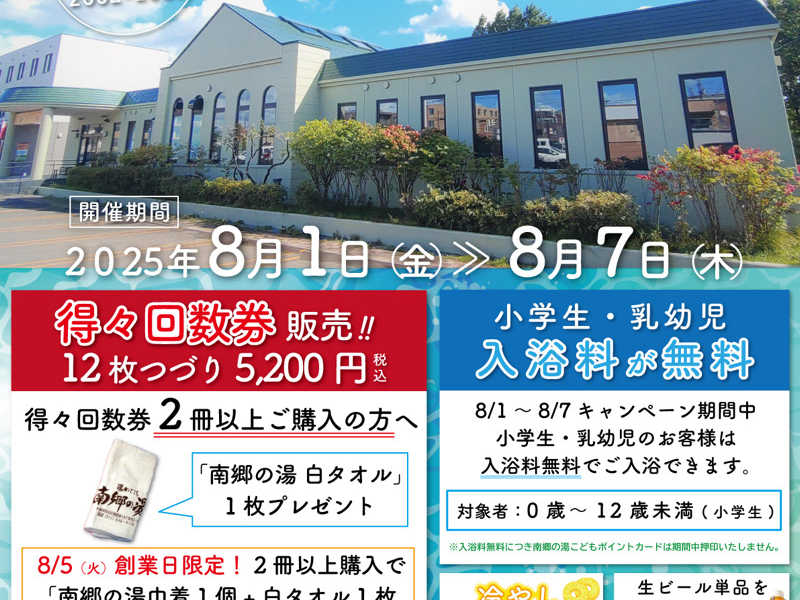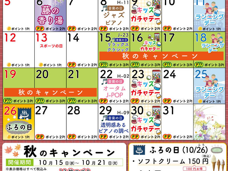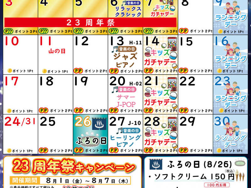 いつものように回数券とスタンプカードを受付に出したらスタンプ3 個押してる❓🤔「えっ、受付のお姉さん間違った❓」と思って8月のカレンダーを見たら、何と23周年祭だったんですね😅8/1〜7までの1週間ポイント3pt👍