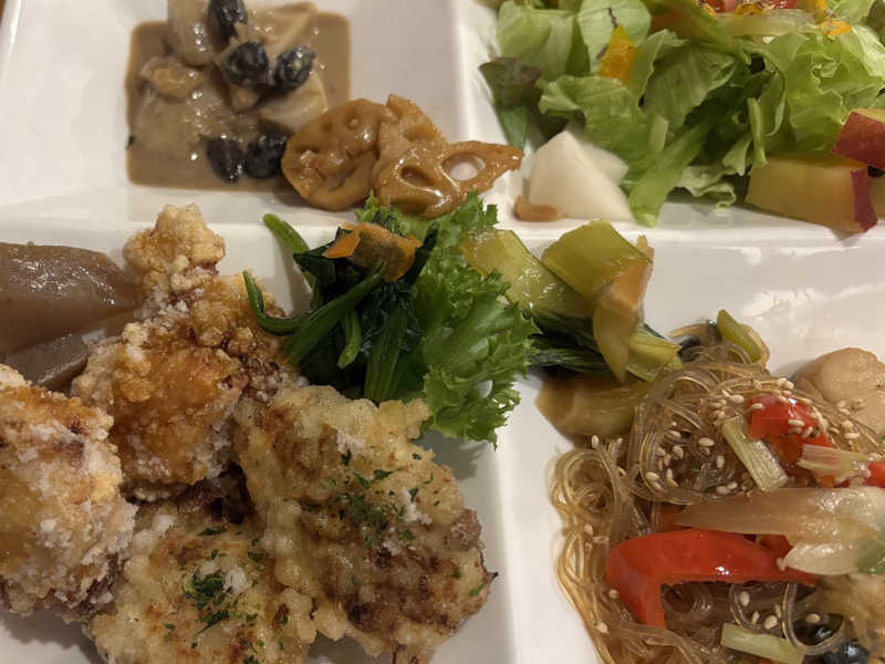 思っていたより脱衣所はこじんまりしていたけど、私の数少ない体験ではお風呂の雰囲気が鹿児島の砂蒸し風呂会館みたいだった。ただ、しきじはお風呂全体の広さで考えるとサウナが広い!予習が足りず、二つのサウナの違いがすぐにわからなかったけど、2回目に薬草サウナに入り、二つはまったく別物でした。薬草サウナ、気持ちよかった。60度?体感温度は90度!独特の香りに包まれて全身が健康になっていく気分でした。そして聖地しきじの水風呂。気持ちよくてずっと入っていられる。水の中でからだが温かくなっていく。実際入りすぎました。4セット、時間の許す限りお風呂もゆっくり浸かって、水筒にお水をいただきました。洗い場に歯磨きのチューブまで備えてあってびっくりしました。そして2階で夕飯。なぜか女性ばかり6人ほど…。次は1日かけてゆっくり来たいな。ああ、幸せ。水に癒されました。しきじさん、ありがとう😊💕