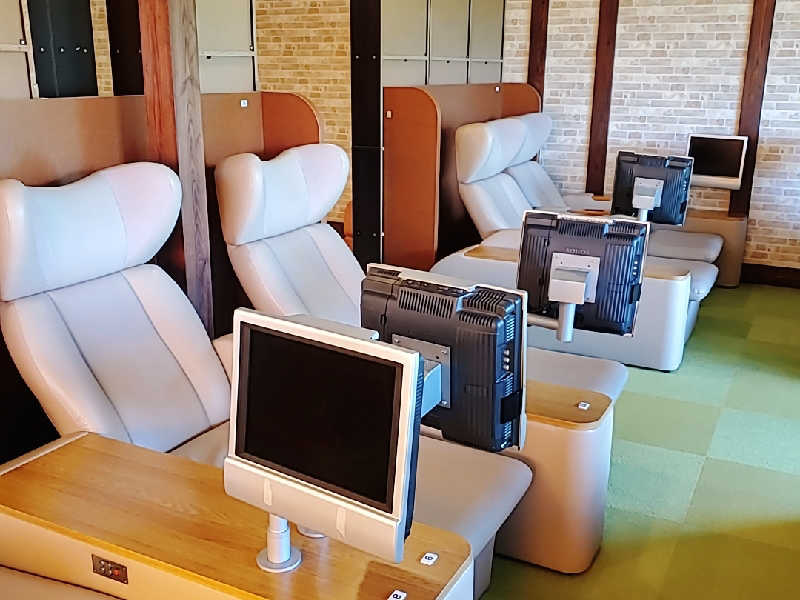 荷物をロッカーに預けたままリストバンドひとつでお食事やコミックルームに行けるのがスマートで良き。※黒酢ドリンク、ガチャガチャやクレーンゲームなど100円玉が必要なものもあります。