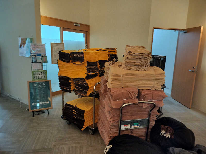 朝ウナ7時に入館したところ、けっこう混んでますな。写真はゆっこならではの大量マットが業者から納入されたところを撮りました。