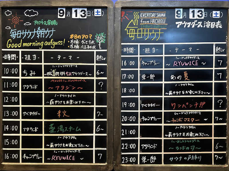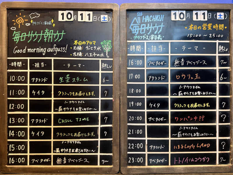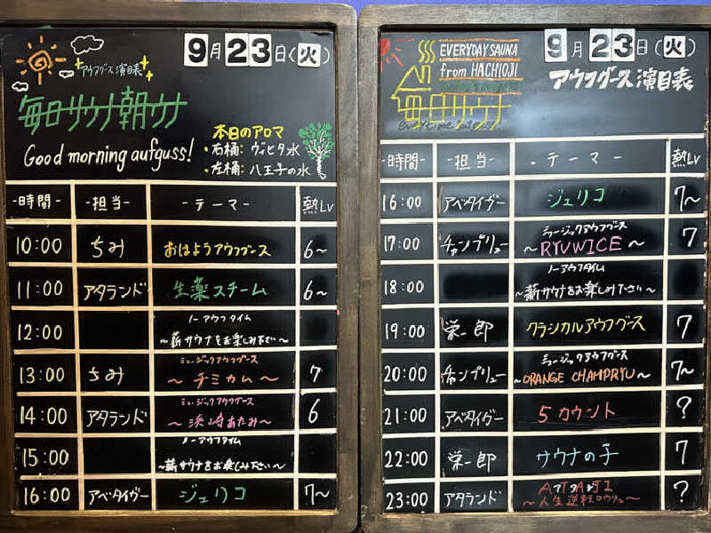 涼しくなってきて、水風呂がいつもより冷たく感じるようになってきた。今日は、ちみさんの「おはようアウフグース」とアタランドさんの「生薬スチーム」を受ける。ちみさんのアウフグースはセージとイヨシコーラの匂い。朝から聴きたい音楽ということでOwl CityのGood Timeが流れる。気持ちいい風を受けてめちゃくちゃととのう。アタランドさんの「生薬スチーム」は「噴霧器でひたすらロウリュをします。以上です。」とのこと。「今日は10ℓ用意しました」。我々が無反応だと、「ここ驚くところですよ!」とのこと。普段のロウリュは2ℓくらいなので約5倍とのこと。噴霧器で普段水をかけないところにもかけて、徐々に熱くなる。生薬のすごい良い匂いがした(AKCのラッコ薬湯みたいな匂い)。「途中でスチームから、ストームに変わりますのでご注意ください」と言われ、途中でヒーリング音楽から嵐の音に変わり、ブロワーが出てきたところで笑ってしまった。ストームになった瞬間からめちゃくちゃ熱かった。爆裂にあまみが出て、猛烈にととのった。今日も最高だった。