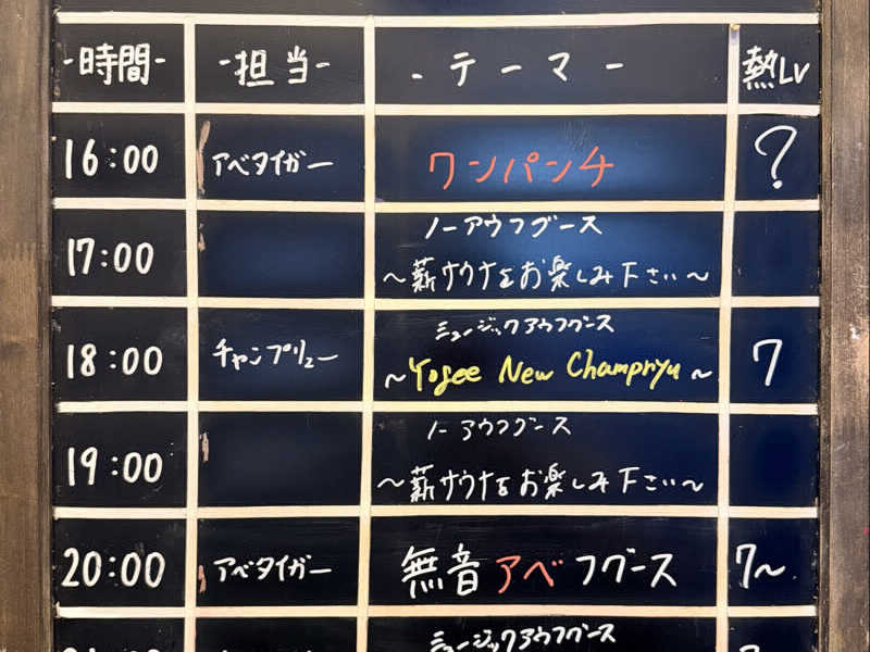 アタランドさんの「八王子 Loyly LAND」を受ける。ディズニーが好きな自分は、何としても受けたかったアウフグース。美女と野獣の朝の風景が流れてスタート。「このアトラクションは途中下車可能です」とのこと。ほうじ茶とアッブルシナモンの匂い?。エレクトリカルパレードとイッツアスモールワールドとミッキーマウスマーチのユーロビートが爆音で流れる。途中両手にブロワーを持って踊り、ビカビカにイルミネーションが付いたタオルを回すアタランドさん。めちゃくちゃ笑った。けど、めちゃくちゃ熱かった。休憩中、星に願いをのオルゴールが流れる中、スプラッシュマウンテンと称して頭に水をかけてもらい爆裂にととのった。