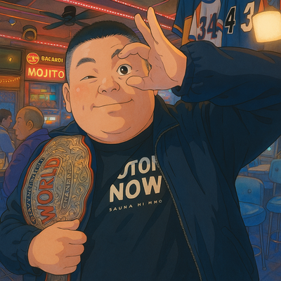 ルチャ・リブレのレスラーが入場の時だけ着て入ってくるような下半分が中途半端なTシャツを着たおじさんが、「ウシャシャシャシャ」と笑いながら携帯いじってる。