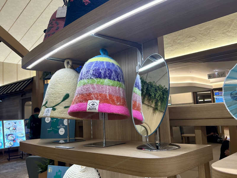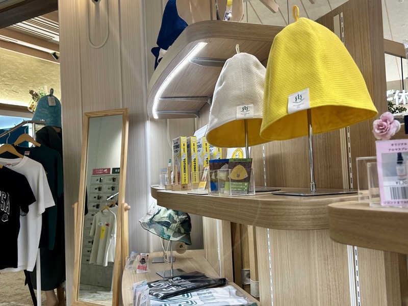 久しぶりのスパメッツァ。売り場には新作サウナハットが多数。
