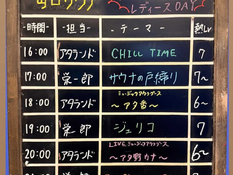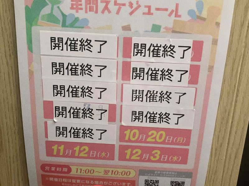 何も知らずふらっと行ったら男湯で熱波祭がやってたので旦那にゴリ押しして一旦別れました、しかしお風呂から上がって合流し感想を聞こうとしたらまさかの事件が起こり受けられなかったとのこと。というのもまず入館したのが13時半過ぎで、案の定14時の回は整理券が残っていなかったので16時の回を狙っていたようなのですが、16時の整理券配布を開始する15時前頃に脱衣所に向かうべくととのいスペースから移動しようとしたところ蜂に追われ転倒、膝から流血して必死で止血している間に整理券はとうに無くなっていたそうです。あまりにも不憫すぎるので今度サウナ代を奢ろうと思ったのですが、考えてみれば私が買った回数券で2人とも入館しているので既に私の奢りでした。女湯でみーさんの熱波がある日私は都内のほうで仕事絡みの試験があり受けられないのですが、男湯では24日にも熱波が開催されるようでその日旦那は休みらしいので是非行ってきてもらいたいところです。