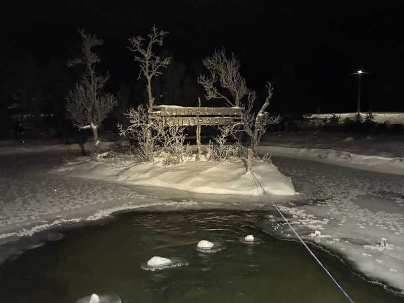 しっかり温まって、マイナス15度の外へ。川の途中を池みたいにした水風呂へ。これは周りも凍っているしアヴァントと言って…いいでしょう笑 ウェルビーのあの水風呂のリアル版です。これまたスオミのヌシによると4度らしい。しかも水流があるので10秒でKO。これはグルシンラバーもご満足いただけるかと思います!