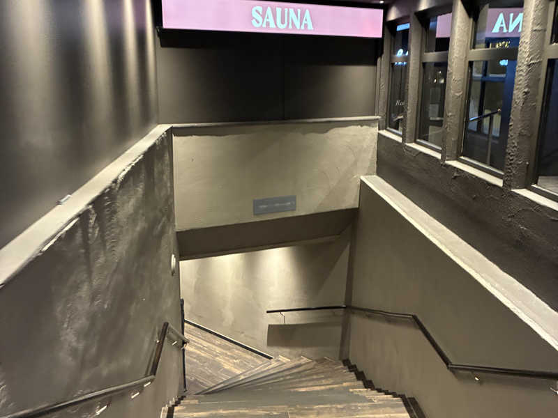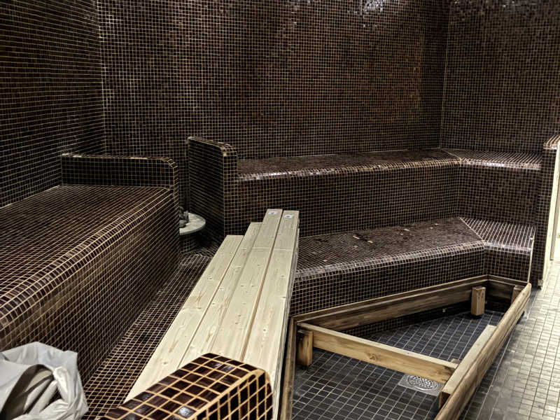 サウナ、でけーー!!コンクリ?打ちっぱなしで、天井は黒くなった木。入り口から囲むようにコの字に5段。右側は下段がなくて下が物置きで1段のみだが6段目のようになっていてそこだけがスノコを背もたれに使える。他の席は5段目はスノコが敷いてあって、4段目から下スノコがないので置かれたスノコを尻に敷く。なおほとんどの方が5段目以上にしか座りません笑 スノコはサ室にある蛇口でゆすいだりゆすがなかったり。出てくる水があっつい!と思いロウリュ用バケツに手を入れてみるとこれもあっつい。なるほどロウリュはあったかい水の方がいいというのは本当なんかな。