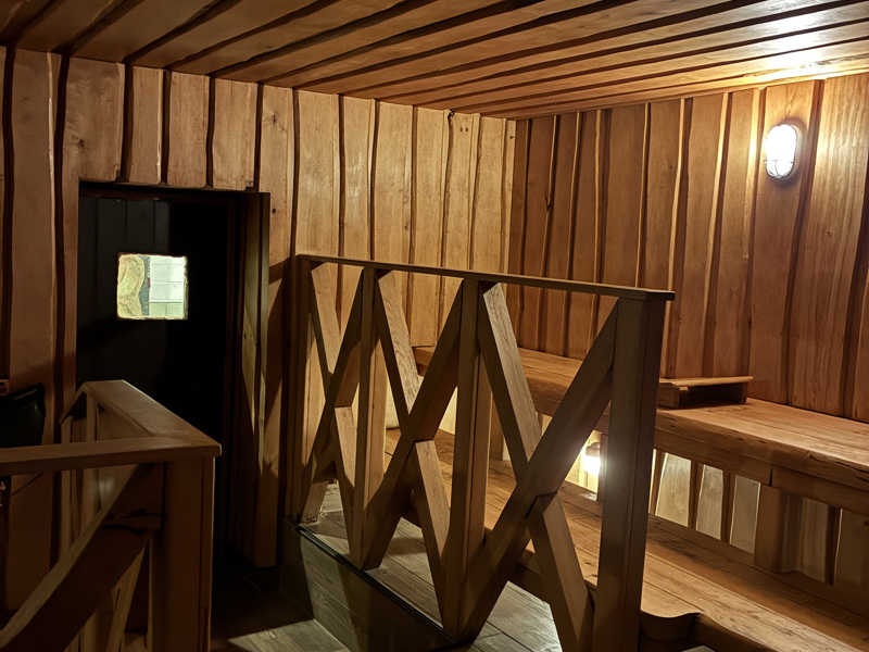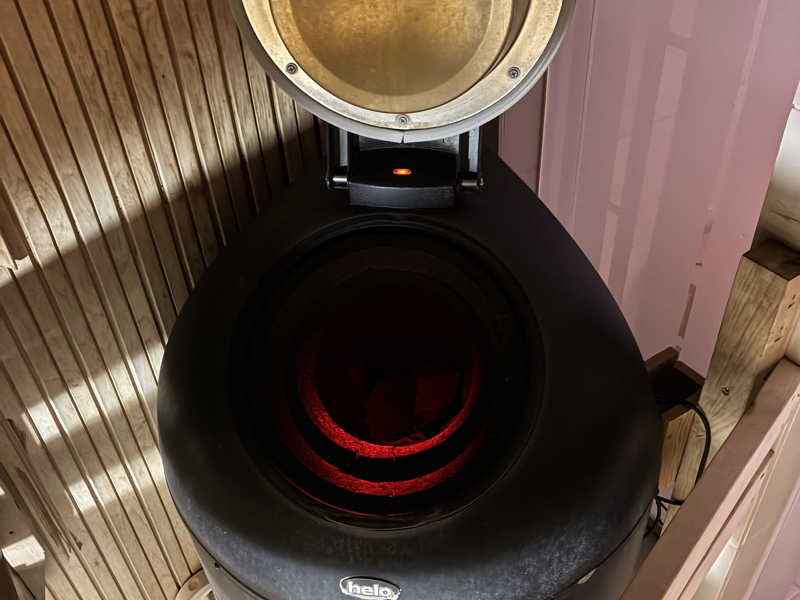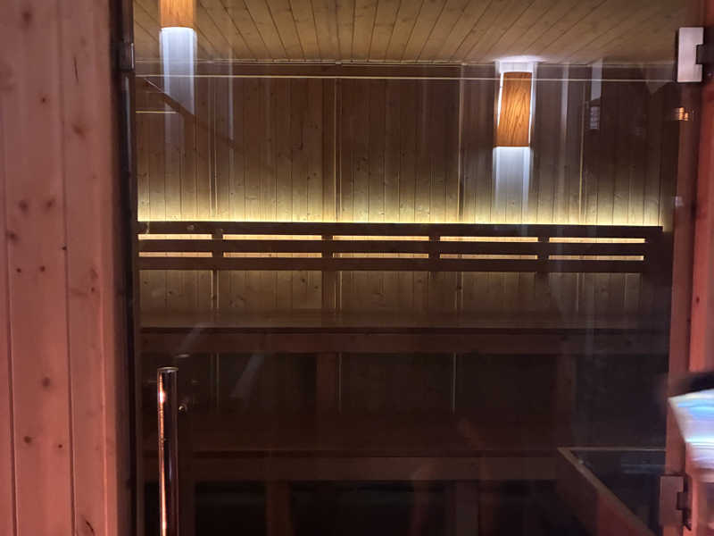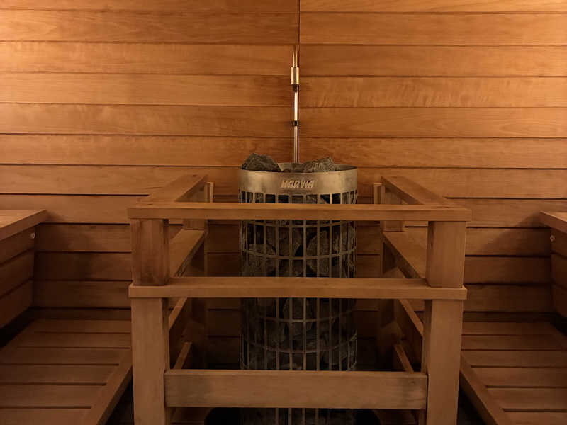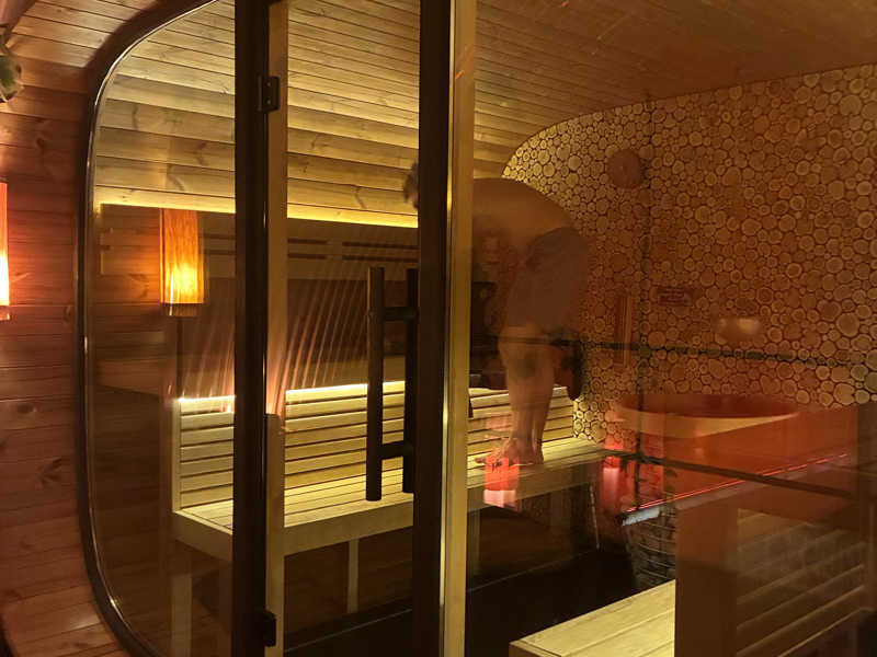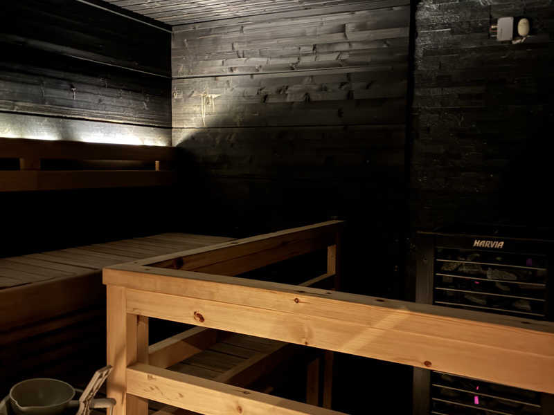 まずは暖炉の近くにあるPrivate Saunaへ。ガラス扉を開けると段を上がって、薄暗い空間にIKI?のようなストーブ。大きめ。🇫🇮お兄がガンガンロウリュしてくれるのでアツアツ。