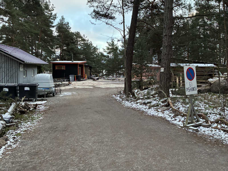 島の公園のような場所で、脇道を進んでいくとそれっぽい雰囲気。薪置き場や事務所的なのが手前にあって、左側には着替えスペース(外)、チャリ置き場。奥にサウナが3つ。更に奥に行くと海。