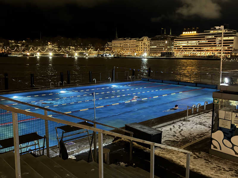 外に出ると、プール。監視員さんもしっかりいらっしゃいます。海水風呂の隣に小屋が3つ。脱衣場1つにシャワー&サウナ室が2つ。小さくてより暗くて狭い方のサウナ室の方が好きだったかな。日本人の方と談笑しつつ、まだ暗い港と市場を見ながらサウニング。