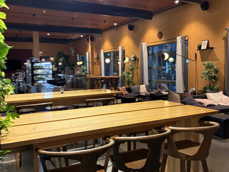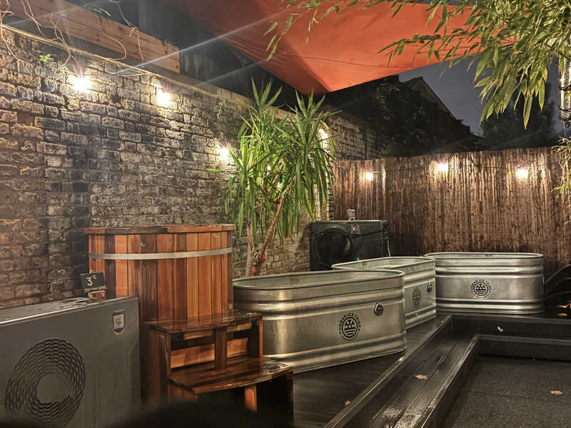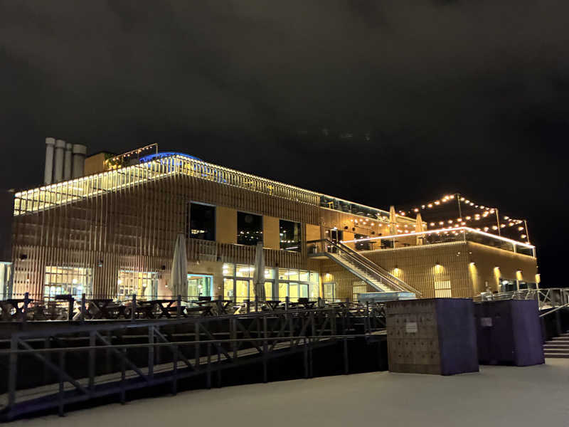 受付の端末で決済し、隣にあるリストバンドを端末下にかざし有効化したのち、入店。中のカフェからでも、外からでもアクセスできる。L字ロッカーからシャワー室を経由して浴室へ。中の休憩スペースにはバーもあって、大きめのサウナ。外に出て建物沿いに回り込むとも一つサウナがありましたがそちらは利用できませんでした。大きいサウナはボタンを押すとロウリュが出るやつ。誰もいない。
