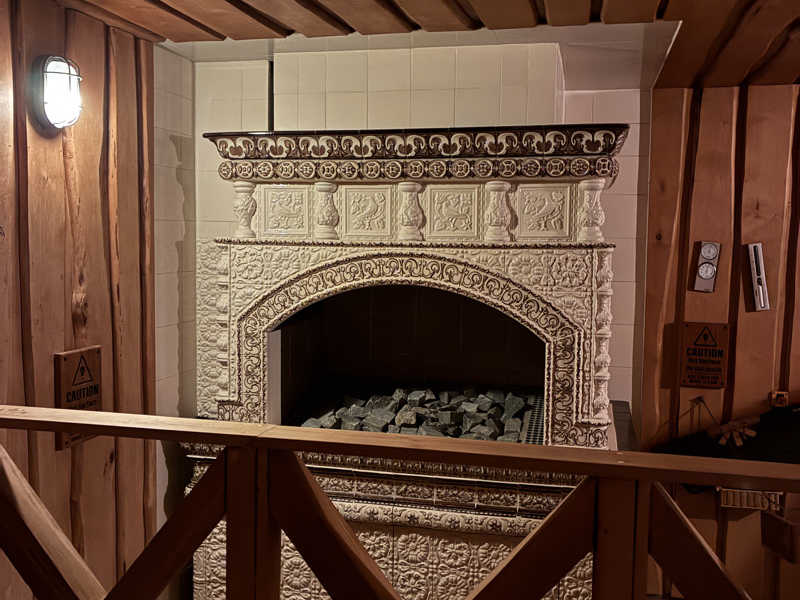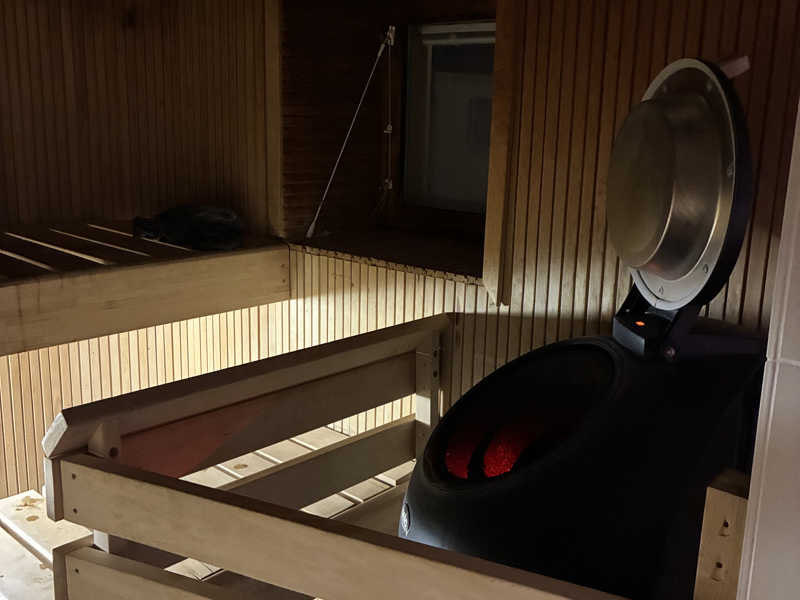 サンダルを装着し、早速スモークサウナへ。ストーブクソデカい。スオミのヌシ的なおばさんによると400-500キロぐらいのストーンがあるらしい。入ってすぐ左手にストーブと、3人ぐらいのベンチ。目の前の階段を上がってそこで8人ぐらい座れるかな。上から投げロウリュができます。ストーブにはデカい蓋ができるようになってます。薫香ですごくいい香り。部屋全体が温められているのでストーブからの輻射ではなく体全体で温められている感覚。下が冷えるという感覚もあまりない。お客さんは🇯🇵4🇰🇷2🇫🇮6かな。スオミの方々の投げロウリュでしっかり熱くなる。天井を触るとしっかりススがつく。