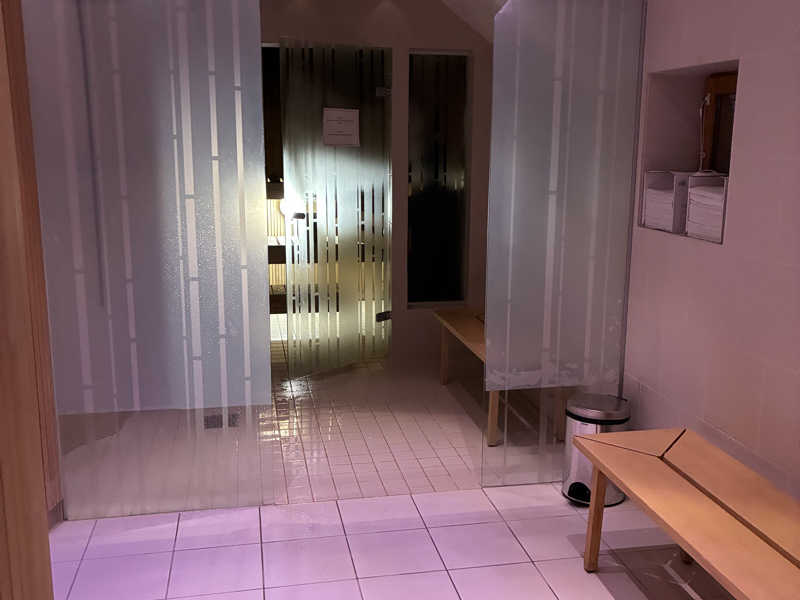 入ってみると時間になるまで待機している人がいっぱい。アジア系が1/3ぐらいかな?日本人が多くて自分含めて7人はいたかな?レストランにはクラブミュージックがかかってオシャ空間です。レストランから脇の通路を進むとサウナのエントランス。バスタオルとサウナマットをもらって脱衣場へ。