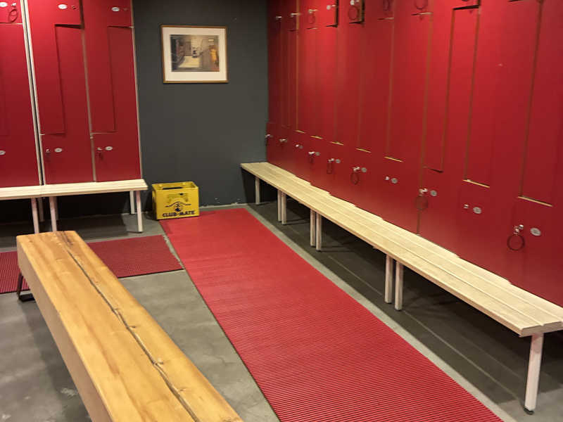 バーカンで料金を支払い、スタッフさんに案内されて中へ。渡されたサウナマットはIKEA。うちのキッチンの皿洗い後の布巾と同じでした笑 入るとロッカーが赤い。とりあえずは水着に着替え、パートナーとMIX SAUNAへ。