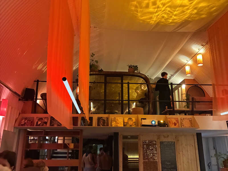 ドアを開けると、広がるチルアウト空間。手前がドライスペースで、ソファがあったりテーブルがあったり。チェスをしたり、寝転んだり。バーカンもあります。DJブースもあって、本日はアンビエントDJの日。アンビエントといっても画一的なものではなく、アンプラグドなものも幅広くセレクトしてくれてます。ソファに座っておしゃべりしながらDJしている姿が斬新笑