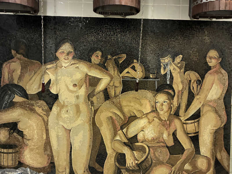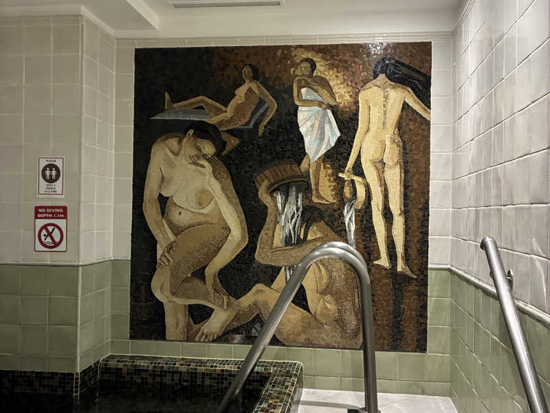 バーニャ上がりには、目の前の女性の裸体の壁画がある桶シャワーへ。からの水風呂。結構冷たい。段差があって座って入ることもできた。