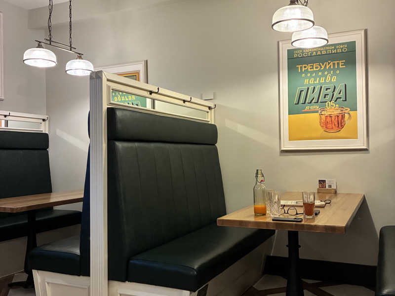 休憩は椅子に座るとメニューが出てきた。どうやら自然と座った席があなたの席ですよ、となるらしい。4人テーブルのボックス席にも全然座れたが、日本人的な癖で普通の丸テーブルの席に座ってしまったw メニューはWEBでも確認できるがロシア料理がいっぱい。モーニングもあったりかなりの充実っぷり。かなり散財したためロシア?のローカルドリンクを。何か忘れたけど嗅いだことのあるアロマの匂いが鼻に抜ける。優しい甘さ。こりゃうまい。6£。隣でイギリス大学生3人組が飲み物に食べ物も頼んでいる。しかもウィスキングの順番を待ちながら。国力の差をまざまざと見せつけられるなかチビチビとロシアバーニャドリンクを楽しむ。