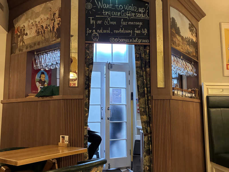 Victoria駅から歩いてすぐ。重厚な扉を開けると、高級エステのような白い空間がお出迎え。ブロンドのロシア美人と黒髪のこれまたロシア美人の受付の方に案内され、地下へ。右手に脱衣所ロッカー、左手にレストラン的なところ、浴室。タオルシーツサンダルを渡される(サンダルはもらえた)。