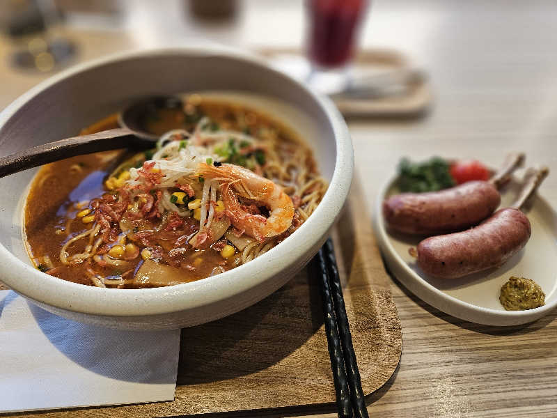 その後、館内着に着替えて休憩&食事へ。売店で「北海道コアップガラナ」を発見。私の好きな飲み物はオロポ、コーラ、ドクターペッパー、麦茶、ルートビール、ガラナなので、もちろん購入、一気のみ!レストランでは「北海道海老味噌ラーメン」と「トンデンファームの骨付きソーセージ」を堪能し、今年のサ活初めを大満足で締めくくりました。