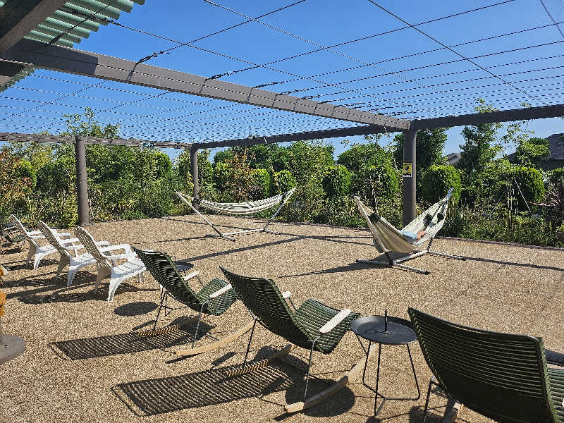 サウナと同階の外気浴は、普通の椅子が至るところに並んでます。