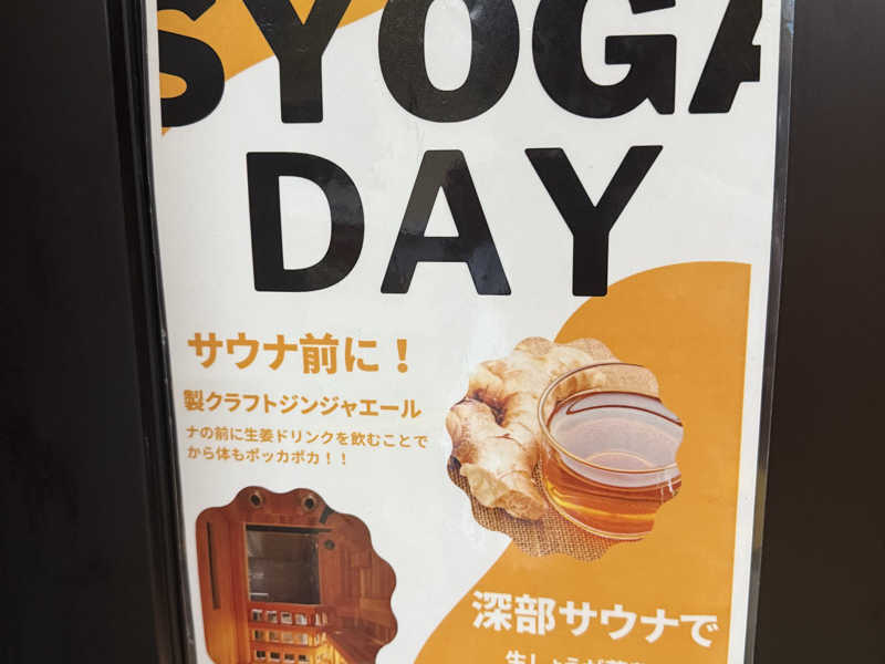 ショウガdayという事もあり、サウナ室には生姜の香りがまた気持ちを落ち着かせてくれる。サービスの生ジンジャエールもピリッと刺激があり喉も楽しませてくれました。