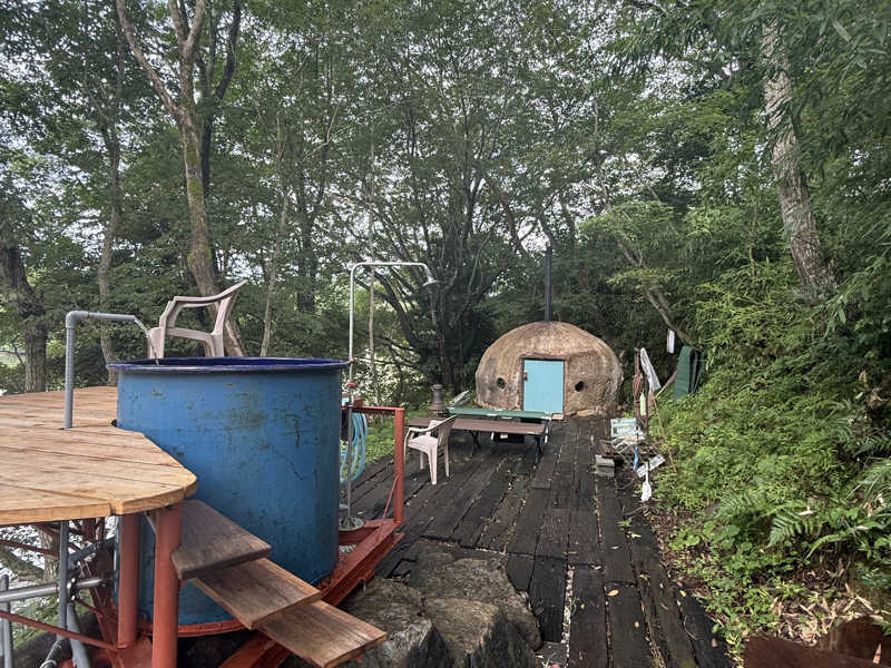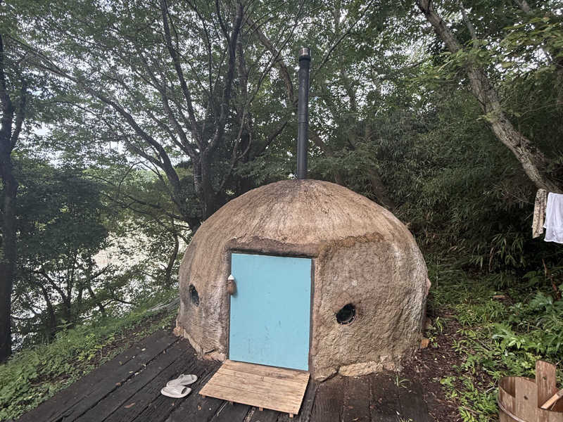 サウナは何と赤土で出来たドーム型サウナ。まるでピザ窯。薪ストーブも手作りで、これがまぁ〜アッツアツ。セルフロウリュでさらに熱々に。