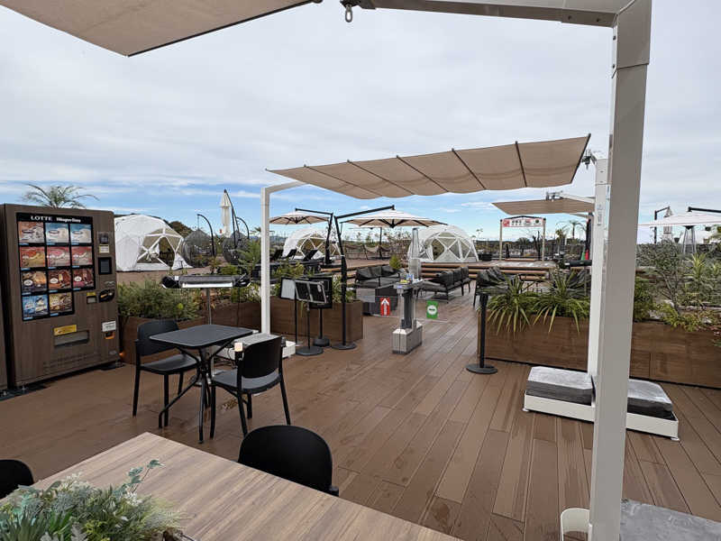 岩盤浴利用客のみが使える屋上のルーフバルコニーが広々で見晴らしも最高。