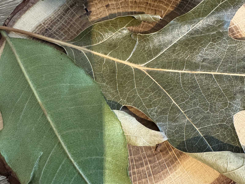 サウナスのお庭でとれた葉っぱを2種類回されて、手で1枚ずつちぎり、