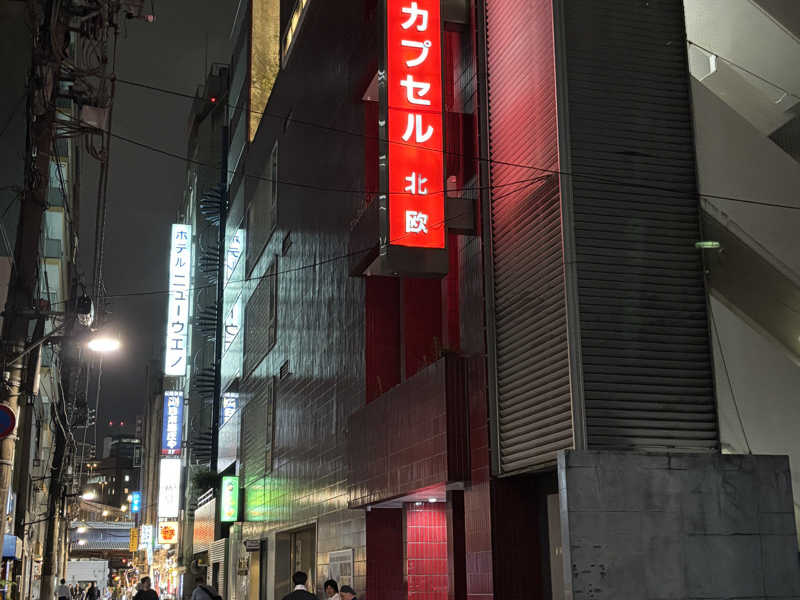 一言:きょうは北欧さんにきましたー!憧れですね、はい!何度となく夢に見た場所です。赤い壁の建物見た途端、テンションが上がります!受付してロッカーで館内着を来た瞬間、これこれってなります😆階段あがり、いざ浴場へ!入った瞬間からいよいよ来たなぁって感じで、サウナ室、水風呂を横目にまずゴシゴシカラダ洗います!ではメインサウナへ。リニューアルしたとはいえ、テレビで見てたのと変わらない雰囲気✨赤っぽい照明に、石造りの壁、オシャレなランプシェード、高く積まれたサウナストーン、全部みてて飽きません☺️2段目奥でもうすっかりナカちゃんさん😀けっこう熱くて、こんなに気持ちよく汗かけるんだからこりゃあみんなに愛されるわけですね!熱くなったカラダをとなりの水風呂でこれまた気持ちよく冷まします!さっきまで赤っぽさから、青っぽさに変わる感じもまたいいです!知らないひとなのに、3人横並びで入るとなんだか勝手に知り合いになった気分です🤣さてとうとう外気浴スペースに移動します!トゴールの湯が真ん中にあり、周りを椅子が囲みます。これこれってなります、何度も見ましたよ!胸高鳴りながら、プラ椅子に座ります!3人仲良かったなぁとか、偶然さんがNiziU踊ってたなぁとか思い出しととのいます😌夜はですね、プラ椅子の後ろが蛍光灯で照らされてなんだかいい雰囲気なんですよね✨車の音、吹き抜ける風、とってもよかったです!次に第ニサウナ室は、先程とはちがい湿度しっかりでヒーリングBGMがかかりゆっくりじっくり汗をかける場所でした!でもやっぱりメインサウナが好きなのは、ぼくがまだまだガキくさいからかもしれません。。夜はそのあとマッサージをうけて激圧でしたが、いいひとだし気持ちいいのでこちらもおすすめです!カプセルはなんでかちゃんと防音されてて、ぐっすりでした!朝起きて、メインサウナを2回楽しみます!朝から気持ちいい汗かけました!浴室の雰囲気も明るく、外気浴も夜とは打って変わってこれまた落ち着いた雰囲気で上野の空の下でととのいました✨なんか日常に寄り添う落ち着いた場所だなと思いました!よくテレビでみたレストランで、北欧カレーも食べて、なんだかうれしく過ごしました!今度はここで3人みたく仲良く誰かと来たいなって思いました!
