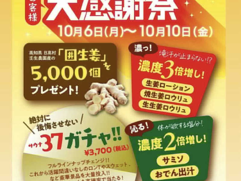 感謝祭で生姜ロウリュウ3倍増しには暑いのは平気だけど毛穴が痛くて参りました。