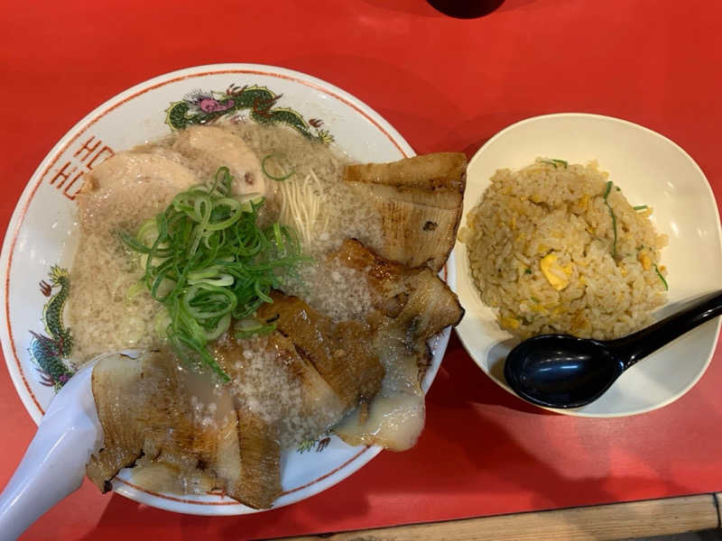 炙りトロ肉ラーメン 替え玉1 半チャーハン おかわり4杯 ちゃんとスープまで飲み干しました
